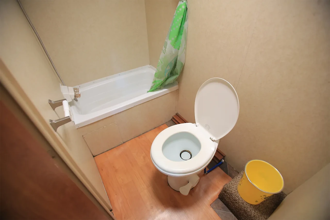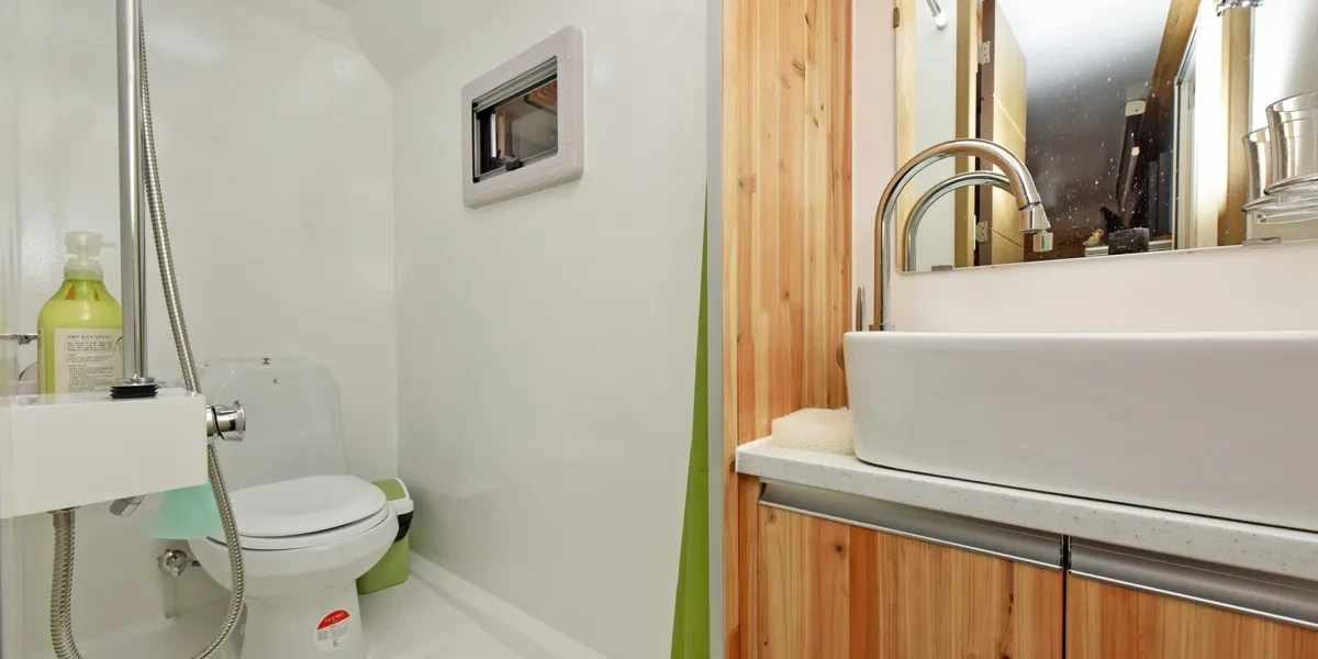 더무빙카라반의 화장실, 샤워실은 공용 시설이다. 샤워실에는 샴푸, 린스, 바디워시, 세안제, 치약이 구비되어 있다.