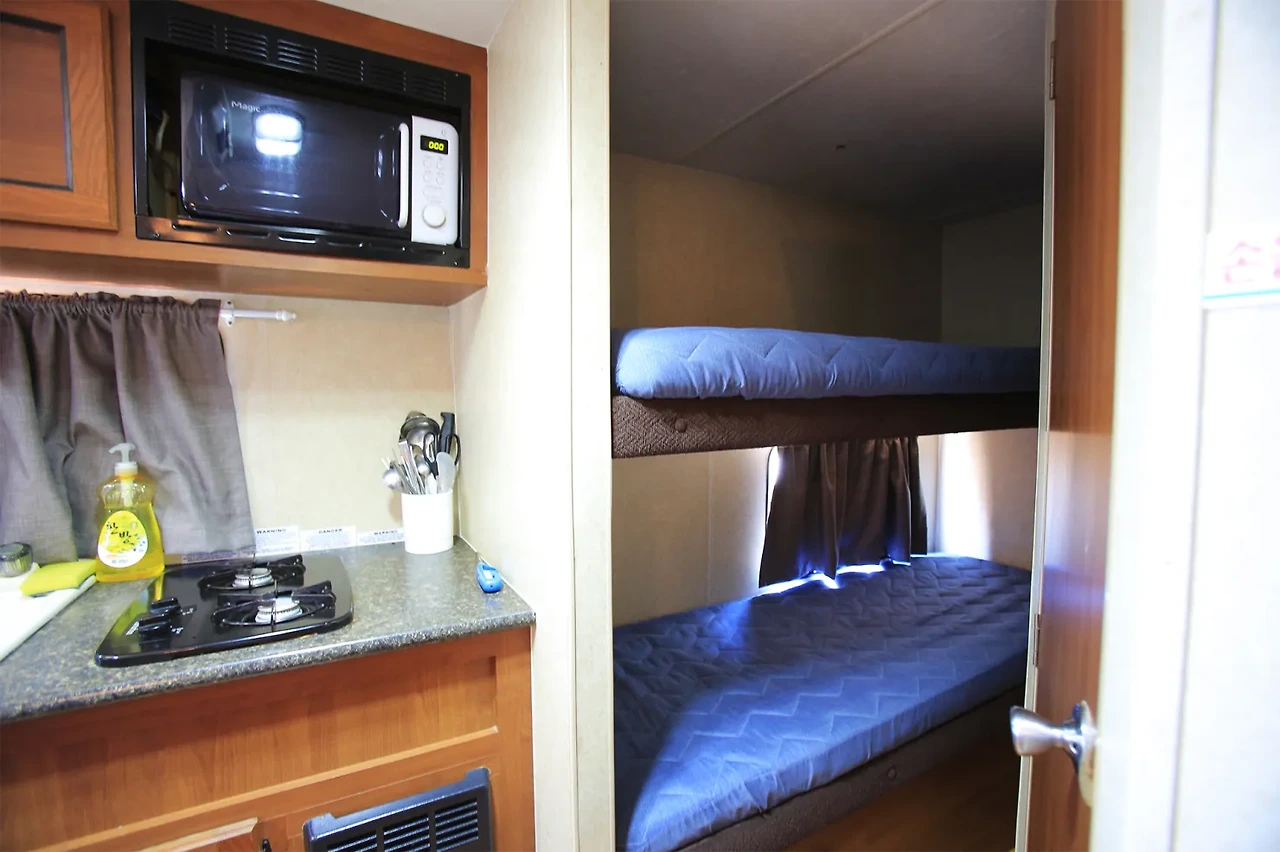 부산 해운대카라반펜션의 카라반1 객실은 기준 인원 2인, 최대 인원 5인이 이용할 수 있다. 킹사이즈 침대가 놓여 있으며 2층 침대, 소파가 있다. 주방 시설이 구비되어 있으며 각종 주방용기도 이용할 수 있다.