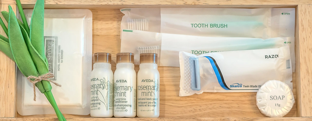객실 어메니티로는 Aveda의 고급 어메니티가 비치되어 있다. 삼푸, 컨디셔너, 바디워시, 칫솔, 치약, 면도기, 1회용 바디스폰지, 비누가 있다.