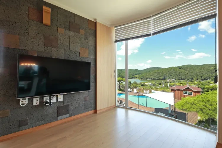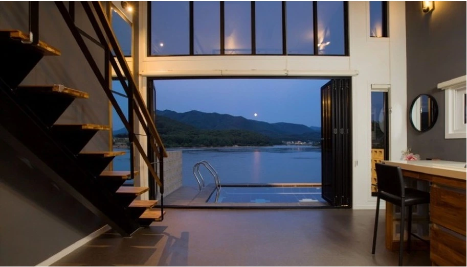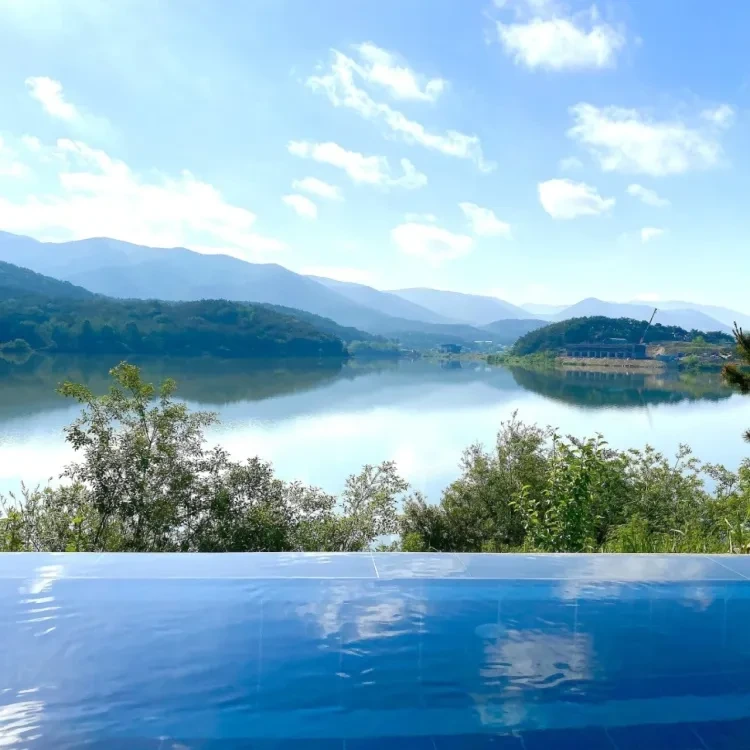 펜션에서 가장 추천하고 싶은 부대시설은 단연코 개인수영장이다. 사진에서 보시는 것처럼 환상적인 뷰를 자랑하는 야외 개인 수영장에서 수영을 즐기실 수 있으며 사계절 이용가능한 온수풀이다. (50,000원 추가요금 발생)