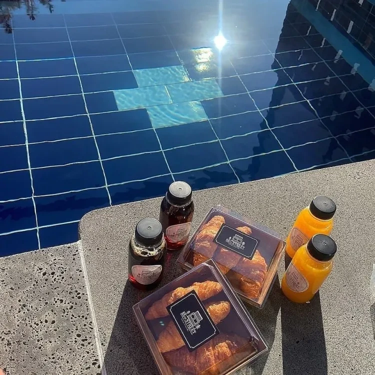 경주 55번가 풀빌라의 조식으로는 계절 과일을 이용하여 직접 만든 건강주스와 크로아상이 제공된다.