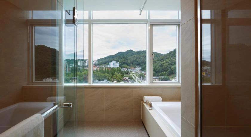 스위트 룸 욕실에는 샤워 부스와 욕조 공간이 별도로 마련돼 있습니다. 최고급 비데도 설치해 놨다.