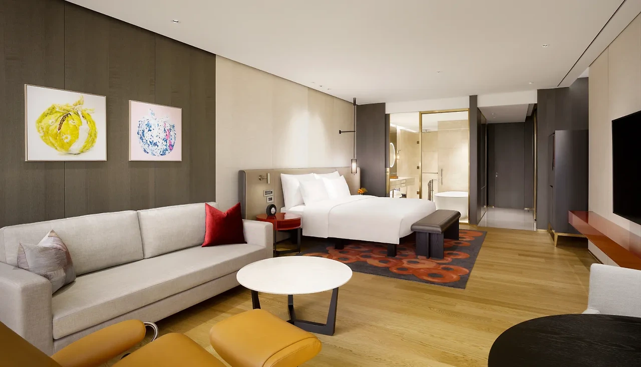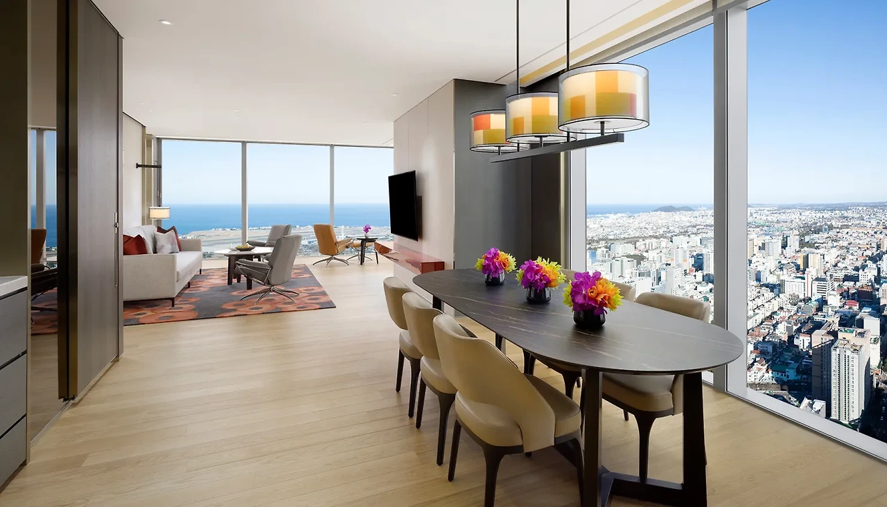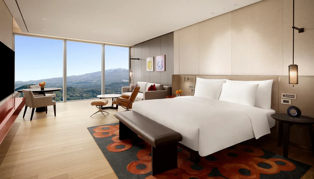 코너 스위트룸은 제주 하얏트 호텔을 찾는 신혼부부들이 가장 많이 선택하는 객실이다. 모던한 인테리어와 초대형 전면 유리창을 통해 한라산과 제주 바다를 막힘없이 볼 수 있는 파노라마 뷰가 특징이다. 호텔 가장 자리에 위치해 있어 시티뷰와 오션뷰, 마운틴뷰를 한 객실에서 즐길 수 있다는게 가장 큰 장점이다.