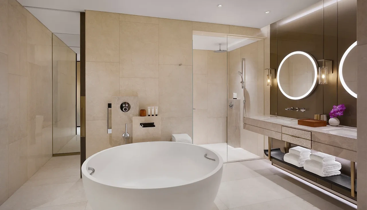 제주 하얏트 호텔 객실 내에는 향이 좋기로 소문난 발망 브랜드의 어메니티가 구비되어 있다. 세면대 2개와 화장실, 욕조가 분리되어 있으며, 기본적인 어메니티 외에도 헤어 드라이기, 헤어롤도 준비되어 있다.