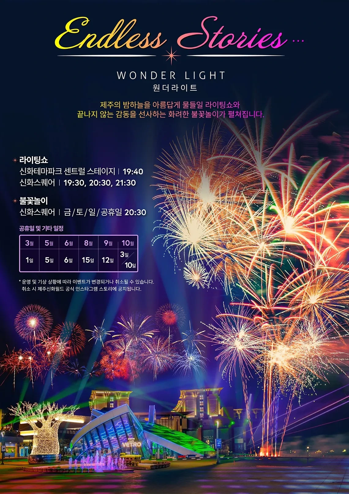 신화테마파트 센트럴 스테이지에서 19시 40분, 신화스퀘어에서 19시 30분, 20시 30분, 21시 30분에 라이팅쇼를 하고 신화스퀘어에서 금토일 공휴일 20시 30분에 불꽃놀이를 진행한다.