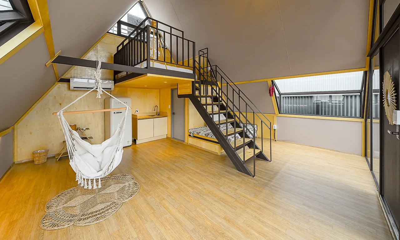 노마드글램핑은 세련된 복층 구조의 객실을 제공한다. 1층은 취사 공간, 2층은 휴식 공간으로 구성돼 있다. 빔프로젝터가 있어 100인치 스크린으로 다양한 스트리밍 서비스를 이용할 수 있다. 명품 스피커인 오닉스 스튜디오 7이 있어 실감 나는 음향은 덤! 객실 내 개별 화장실이 있어 샤워도 가능하다. 어메니티는 몰튼 브라운 제품이 제공되니 호텔만큼 좋은 가평글램핑이다.