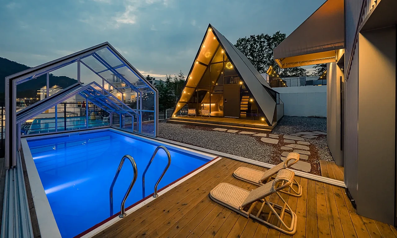 타입 A는 개별 수영장을 보유하고 있다. 개폐형 돔 시설로 날씨에 구애받지 않고 사용 가능한데, 따뜻한 온수풀로 추위도 걱정 없다! 수영장과 객실이 바로 연결돼 동선도 편리하다.