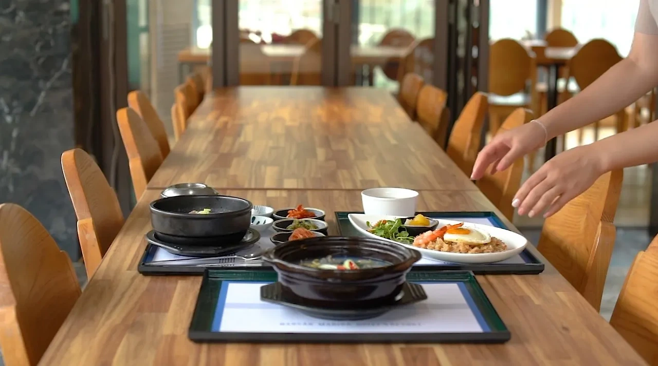 조식은 통영 한산마리나리조트 불곰횟집에서 매일 아침 제공된다. 지역의 맛이 물씬 느껴지는 굴국밥과 한우곰탕, 새우살 볶음밥 등 단품 메뉴 중 선택 가능하다. 숙소 상황에 따라 테이크 아웃으로 진행된다.