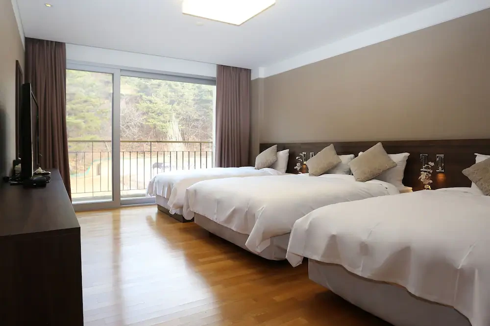 화이트 바탕에 우드 컬러로 포인트를 준 외관은 주변 경관과 잘 어우러 진다. 객실은 한국적인 단아함과 현대적인 모던함이 조화를 이룬 인테리어로, 편안하고 안락한 분위기인데, 가족 여행자에게 안성맞춤이다.