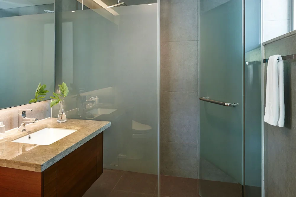 빌라동 파인 객실은 2개의 샤워실을 갖췄다. 대신 욕조는 없다. 어메니티로는 샴푸와 컨디셔너, 바디 클렌저, 바디로션이 제공되며, 이외 샤워캡과 면봉, 화장솜, 빗을 비치해 놨다. 칫솔과 치약은 따로 챙겨 와야 한다.