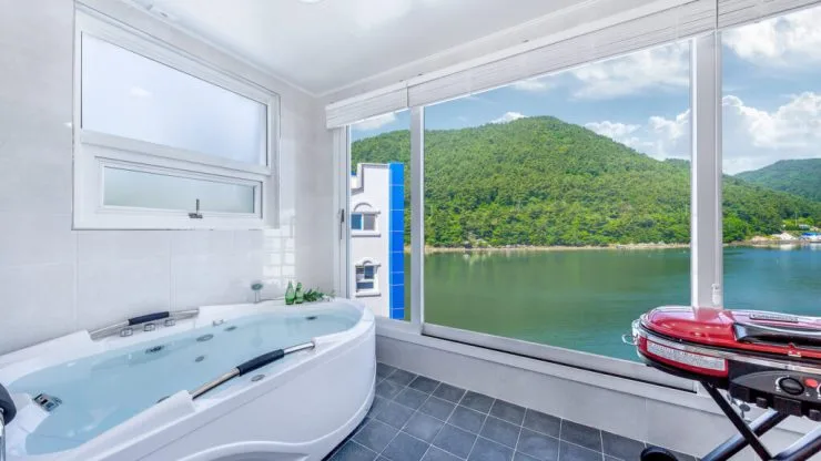 통영 펜션은 모든 객실에서 오션뷰를 감상할 수 있다. 끊김 없는 파노라마 뷰로 눈이 즐거운데, 객실 타입은 원룸, 투룸, 복층형으로 다양하다. 투룸을 제외하고는 스파도 가능한데, 객실에 따라 노천, 월풀, 제트 등 다른 스파 기기가 설치돼 있다. 개별 테라스에서는 맛있는 바비큐도 즐길 수 있다.
