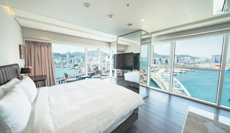 코너 더블 오션룸 객실은 부산 라발스호텔의 시그니처 객실이다. 확 트인 공간감을 자랑하는 넓은 객실이 특징인데, 영도대교와 부산대교, 부산항대교를 모두 품은 파노라마 오션뷰를 즐길 수 있다.