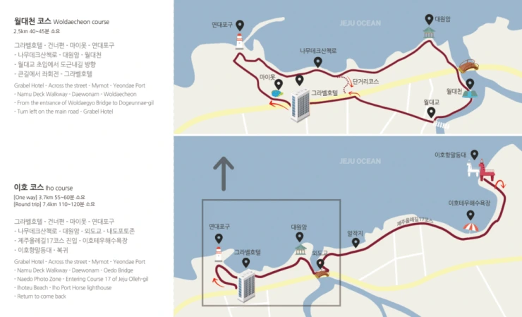 숙소 주변으로 바다를 보며 산책하기 좋은 코스가 마련돼 있다. 아이들과 함께라면 예쁜 카페가 많은 ‘월대천 코스’를 추천한다. 코스가 길지 않아, 가볍게 걸을 수 있다. ‘이호 코스’는 살짝 멀긴 하지만 대신 포토존이 곳곳에 자리했다.