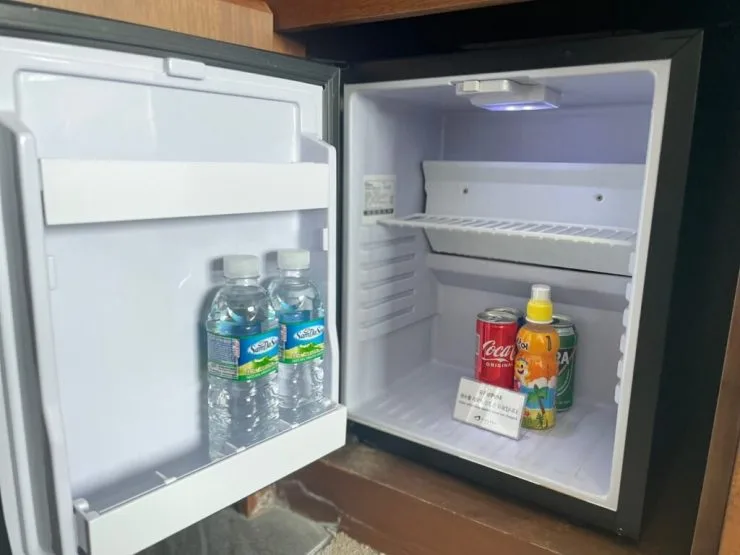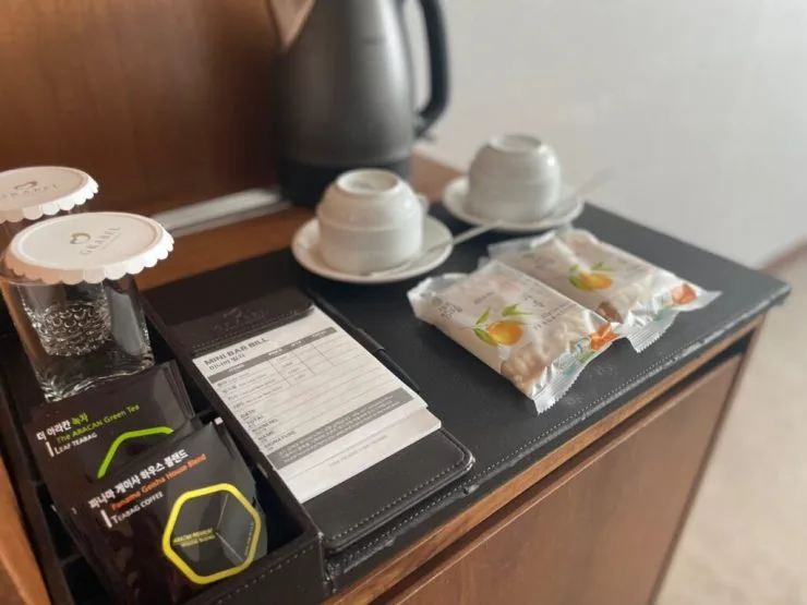 제주 그라벨호텔 전 객실에는 요즘 인기 많은 감귤과즐이 웰컴 선물로 비치돼 있다. 커피 또는 녹차와 함께하기 좋다. 냉장고에는 기본적으로 생수가 무료로 제공되며, 다른 음료는 유료로 판매 중이다.