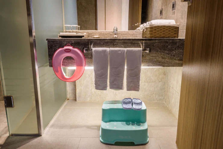 욕실에는 비데가 설치돼 있다. 아울러, 아이를 위한 발판과 변기 커버도 비치해 놨다. 기본 어메니티로는 샴푸와 린스, 바디워시, 샤워캡, 헤어드라이기가 제공된다. 칫솔, 치약만 따로 챙겨 오면된다.