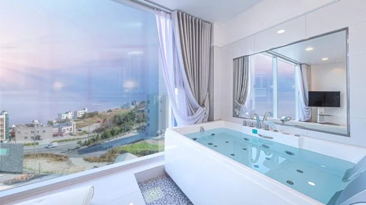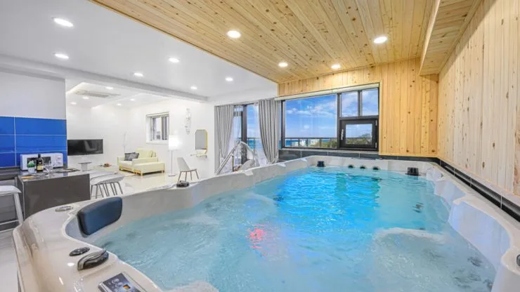 숙소는 하평 해변 근처에 자리했다. 해안로 가운데 위치해, 드라이브 후 방문하기 좋다. 편안한 잠자리를 위해 전 객실에 호텔식 침구류를 제공하고 있으며, 어메니티와 상비약도 완벽하게 갖춰 놨다. 또한, 모든 객실에 스파 욕조를 설치해 두었다. 특히, B동은 아이 여럿이 들어가서 놀아도 될 정도의 대형 스위밍 스파를 구비했다.
