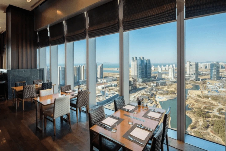 송도 오크우드 호텔 최고층인 65층에 자리했다. 탁 트인 전망으로 서해의 붉은 노을부터 반짝이는 야경까지 시시각각 변하는 뷰를 즐길 수 있다. 무조건 창가 자리를 추천!! 단, 미성년자 입장은 제한되니, 미리 확인하도록 하자.