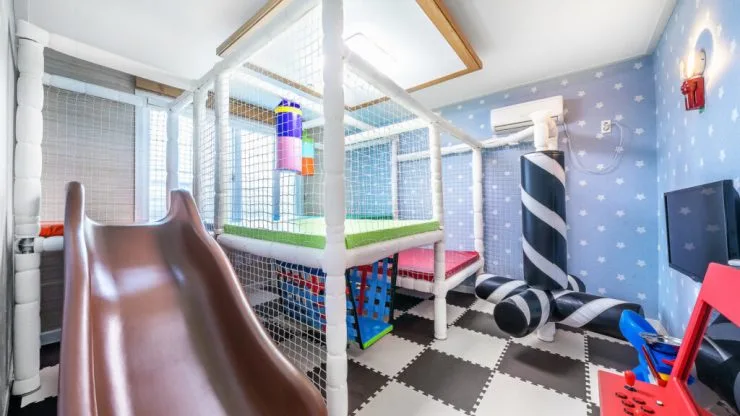 깔끔한 느낌의 독채 펜션이 옹기종기 모여 있다. 빈티지한 인테리어로 1층엔 아이들이 즐길 수 있는 놀이시설, 2층엔 쉴 수 있는 취침 공간으로 분리되어 있는 풀빌라로 침대엔 아이들이 떨어지지 않도록 가드가 설치되어 있다. 대부분의 인테리어는 아이들에게 맞춰져 있다.