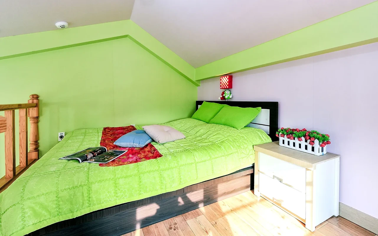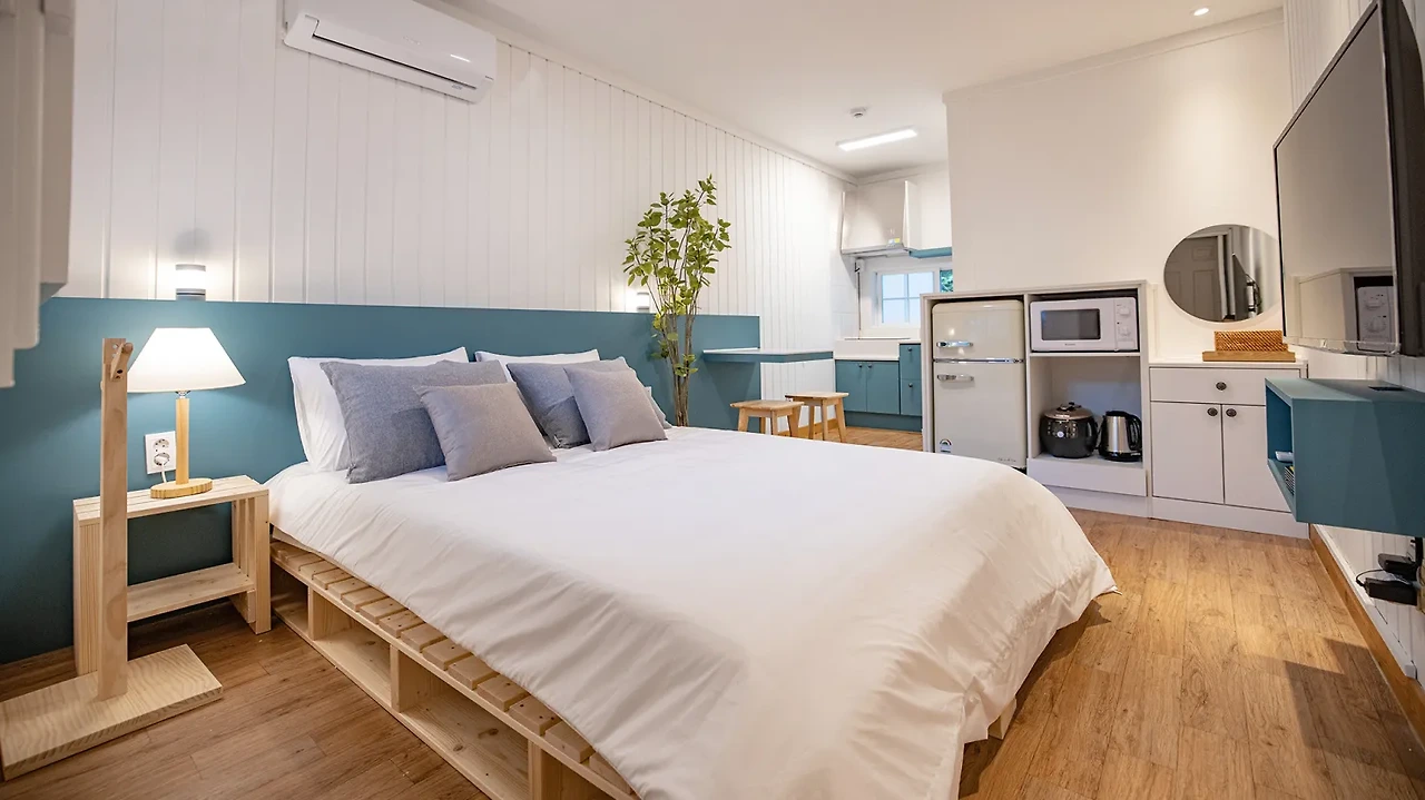 스테이캠프는 강원도 평창에 위치한 계곡 펜션이다. 흥정계곡의 맑은 물에서 여름 여행을 즐길 수 있는 곳인데, 수상 레저를 즐길 수도 있으며 아이들도 안전하게 물놀이를 즐길 수 있다. 객실은 퀸 베드 1개가 놓여 있으며 최대 3인까지 입실 가능하다.