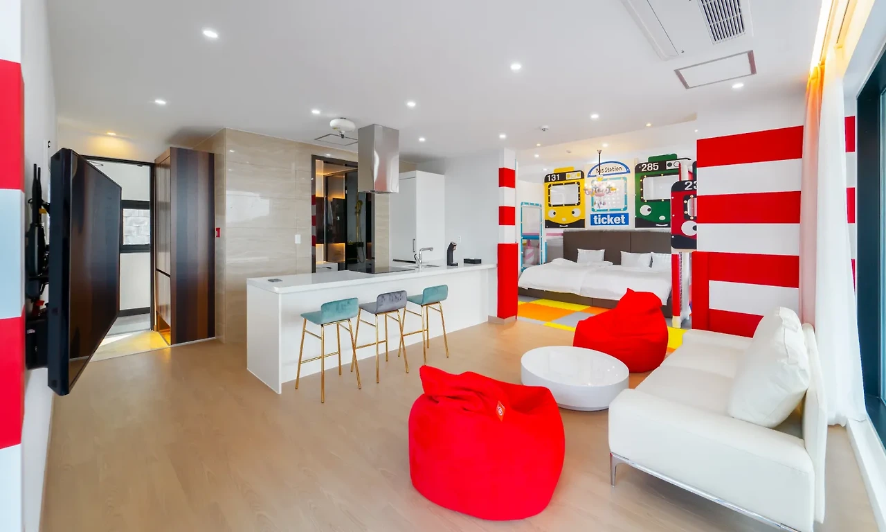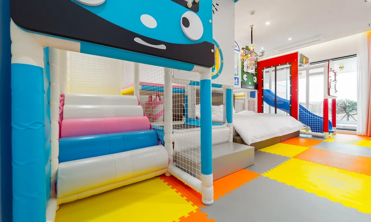 여수 블루망고 풀빌라의 키즈 풀빌라는 4인 가족이 머무르기 좋은 객실이다. 그린(올라프), 핑크(타요) 2가지 테마가 제공된다. 거실에는 실내 놀이터도 설치돼 있다. 주방에는 취사도구 및 식기도 잘 갖춰져 있다. 정수기도 있어 편리하다.