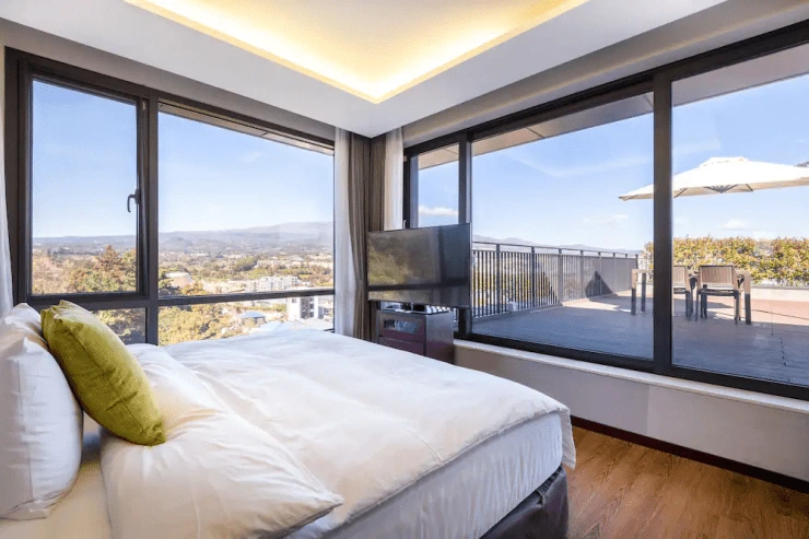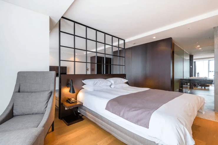 브라운 스위트 객실은 크게 스탠다드와 디럭스, 스위트, 펜트하우스로 나뉜다. 올스테이로 5만 원대부터 예약 가능하다. 기본 룸인 스탠다드 더블을 살펴보면, 퀸 베드와 47인치 Full HD TV, 소형 냉장고, 전기 주전자 등을 갖췄다. 천장부터 바닥까지 이어진 창을 설치해 놔, 공간이 훨씬 더 넓게 느껴진다.