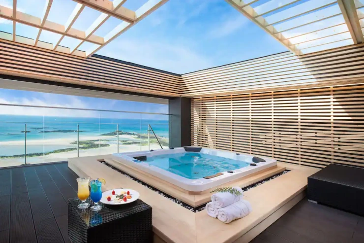 에메랄드빛 바다와 흰모래사장이 어우러진 함덕 서우봉 해변에 자리한 숙소다. 4개의 연회장과 레스토랑, 루프탑 라운지, 탁구장, 비즈니스 센터, 코인 세탁실 등을 갖췄다. 9층 ‘모던 료칸’에서는 탁 트인 전망으로 바다를 바라보며, 스파를 즐길 수 있다. 시간대에 따라 와인과 칵테일도 제공된다. 이보다 로맨틱할 수 없지 않을까??