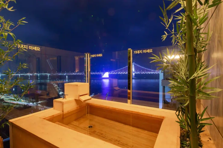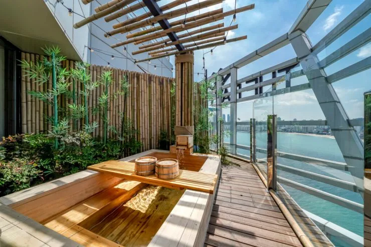 로비는 건물 15층에 위치했다. 모든 부대 시설은 객실에서 프라이빗하게 이용 가능하다. 객실마다 히노키탕과 족욕탕을 설치해 두었다. 아이들은 키즈풀로도 얼마든지 사용할 수 있다.