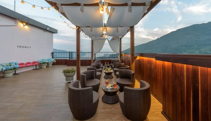 숙소는 카페와 매점, 루프탑 하늘 정원도 운영하고 있다. 멀리 나가지 않아도 숙소에서 웬만한 건 다 해결 가능해 편리하다. 루프탑에서는 탁 트인 전망도 감상할 수 있으니 방문 필수!