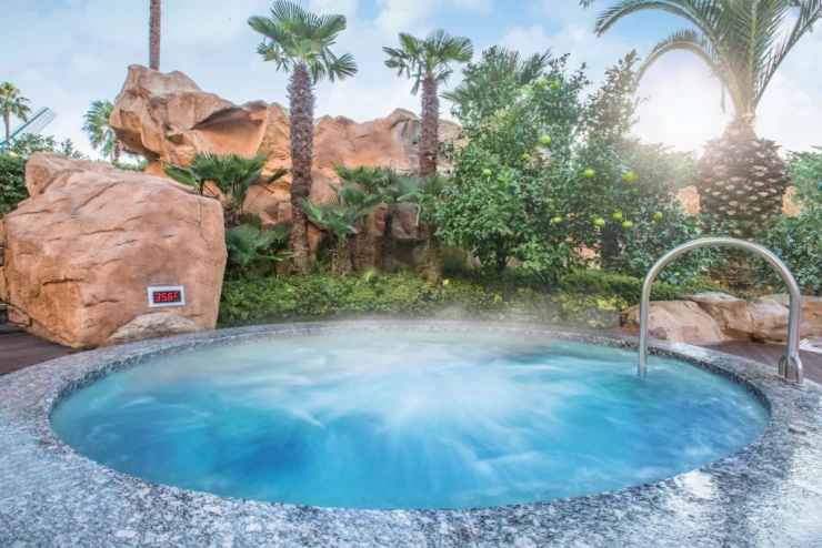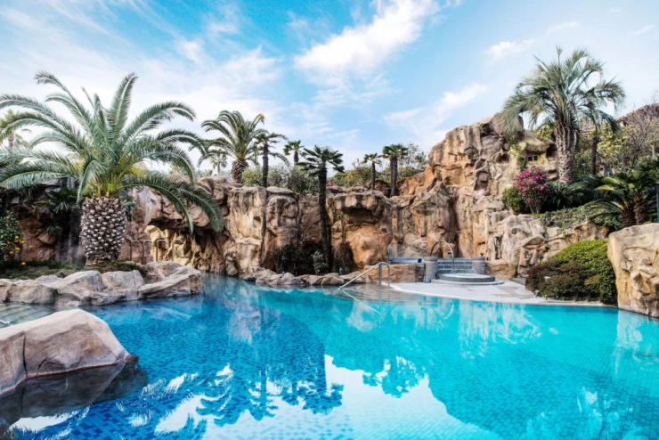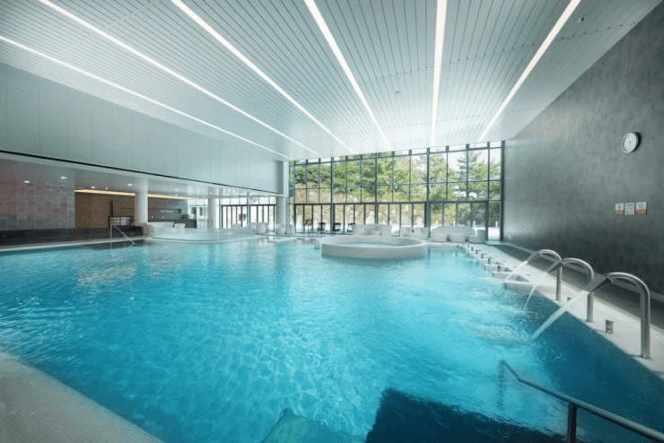WE호텔에는 최신 장비와 화산 암반수를 사용한 실내·외 수영장과 사우나, 자쿠지 시설이 마련돼 있다. 야외 풀장은 숲에 둘러싸여 신비로운 분위기를 풍김다. 실내에는 유아 풀장을 별도로 갖춰 놔, 아이와 찾기 좋다. 아울러, 호텔 웰니스 센터 워터 존에서는 물과 함께하는 치료 프로그램을 운영 중이다.