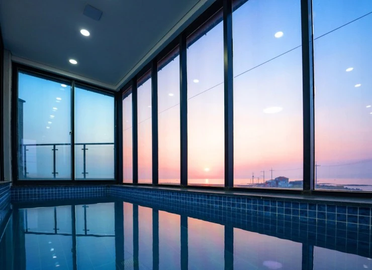 제주도풀빌라는 복층 구조로 1층은 거실과 실내 수영장, 부엌 / 복층은 침실과 야외 스파를 즐길 수 있게 설계되었다. 수영장에서는 아름다운 파노라마 오션뷰도 감상할 수 있다. 길이가 긴 편이라 성인도 물놀이 가능하다. 실내라 날씨에 구애받지 않는다는 점도 매력적이다. 미온수 이용 시 100,000원의 추가 이용 요금이 추가된다. 야외 스파는 온수를 무료로 이용할 수 있다.
