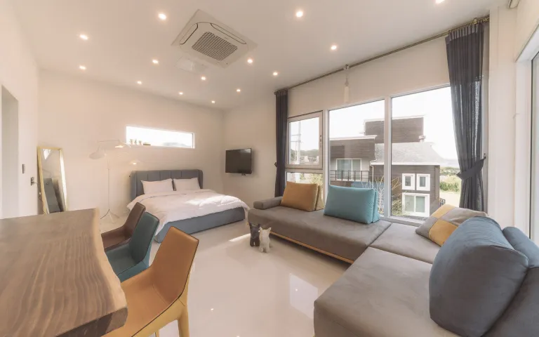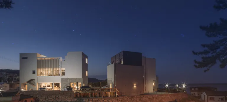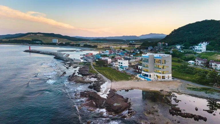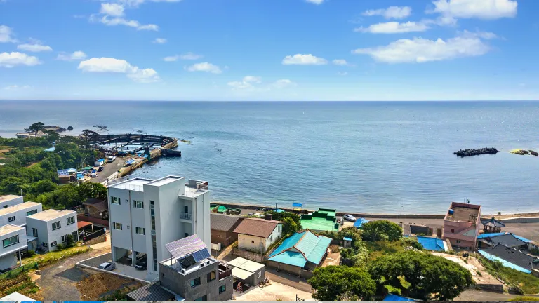 남구 장기면의 조용한 어촌 마을에 위치한 펜션이다. 전 객실에서 아름답고 그림 같은 바다 풍경을 마주할 수 있다.
