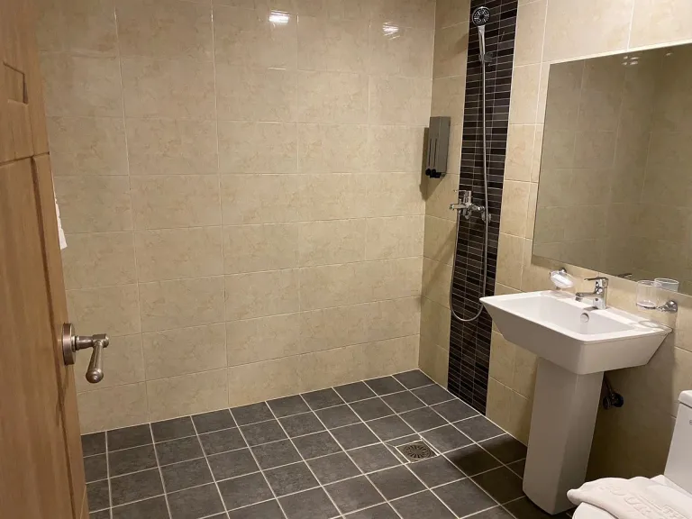 화장실도 넓다. 샴푸, 바디워시, 비누, 수건 등 기본 어메니티가 제공된다. 칫솔, 치약 등 개인 세면 도구는 따로 챙겨 가야 한다.