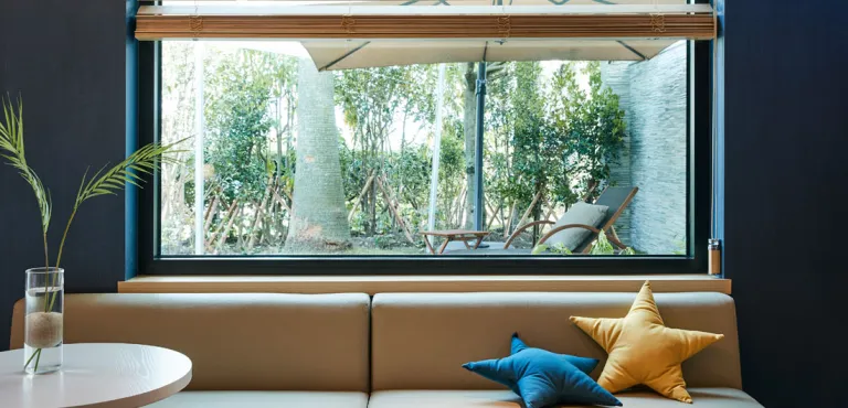 객실이 넓은 편이며 통유리창 너머 보이는 푸르른 풍경이 아름답다. 이 객실은 2층에 자리했다.