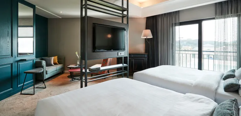 제주 스위트 호텔의 코너 디럭스는 더블침대 2개가 놓여있는 객실이다. 침실, 욕실, 발코니로 이루어졌다.