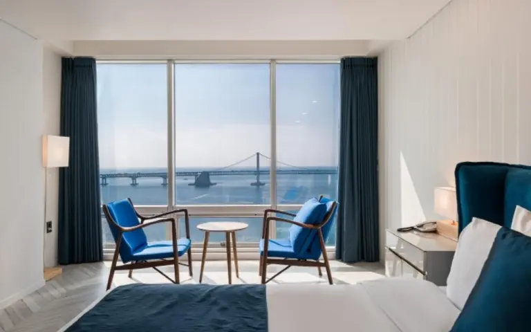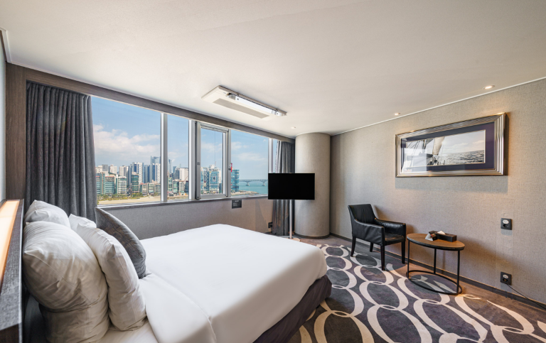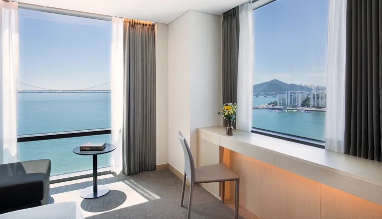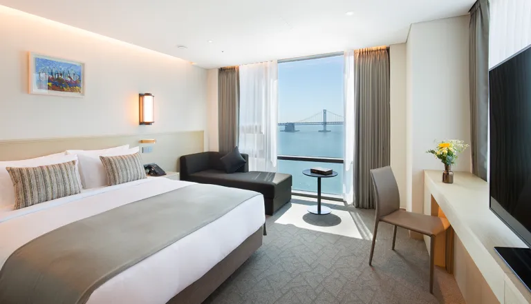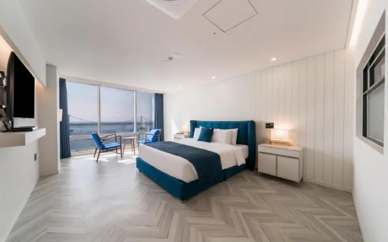 시그니쳐 더블, 스위트룸은 리모델링된 객실로 좀 더 트렌디한 인테리어도 즐길 수 있다. 바다를 닮은 블루 컬러를 포인트로 사용해 시원한 느낌이 물씬 풍기는 광안리호텔이다.