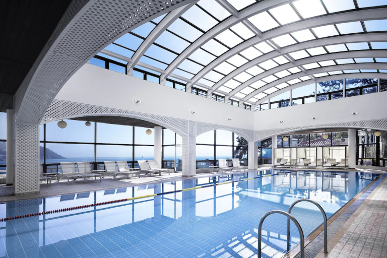 파크 하얏트 수영장은 실내에 자리했다. 전면 유리창을 설치해, 낮에는 해운대 바다를 바라보며 수영을 즐길 수 있다. 정원을 연상케 하는 인테리어는 저녁이 되면, 광안대교 야경과 어우러져 이국적인 분위기를 만들어 준다.