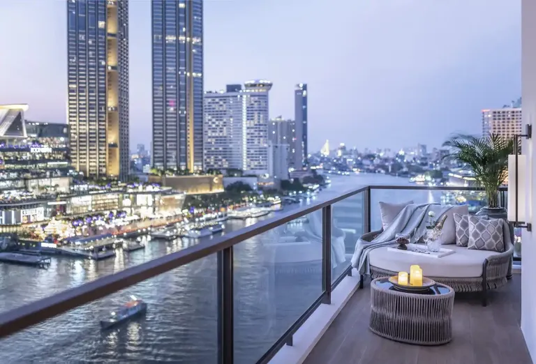 커다란 통창을 통해 리버뷰를 감상할 수 있다. 특히 이 객실에는 발코니도 있어 루프탑 바 부럽지 않은 야경을 누릴 수 있다. 편안하고 조용히 방콕의 밤을 즐기고 싶다면 추천한다.