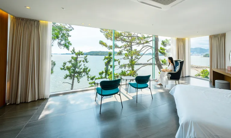 객실에는 주방시설이 마련되어 있으며 취사도구도 구비되어 있다. 통유리창으로 이루어져 탁 트인 바다 전망을 감상할 수 있다.