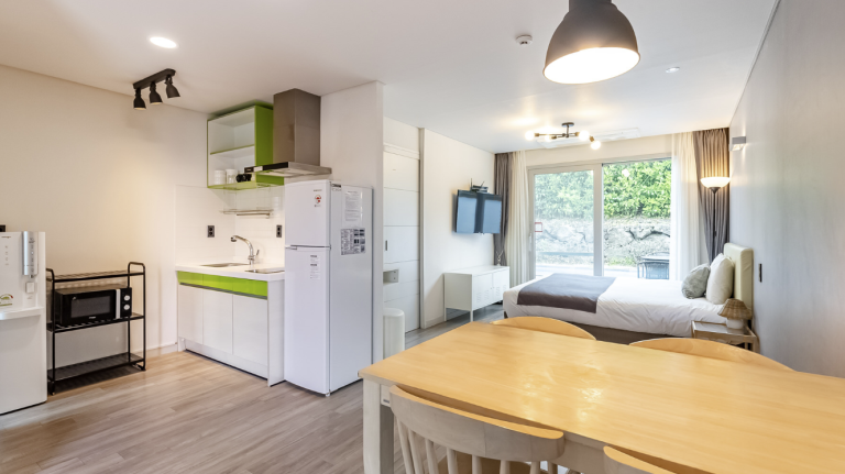 두루 인기가 높은 소랑 개인풀 객실은 문을 열면 침실부터 주방까지 한눈에 보인다. 주방에는 전자레인지부터 정수기, 냉장고, 인덕션 등을 두루 갖췄다. 개별 수영장은 조명을 사용해, 저녁에도 이용 가능하다.