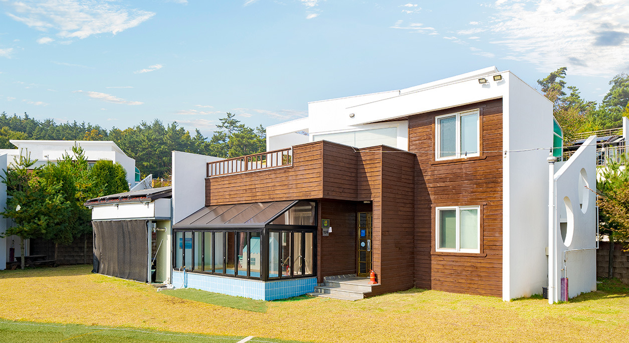 펜션 부대 시설로는 노천 카페와 BBQ, 전기 자동차 충전소 등을 갖췄다.