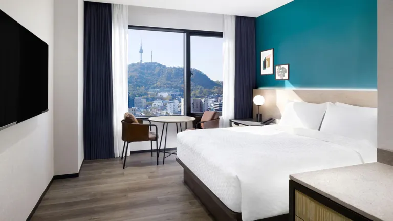 포포인츠 쉐라톤 명동 호텔 슈페리어 더블룸 남산뷰 객실은 남산서울타워를 전면에 마주하고 있으며, 모던한 인테리어 덕분에 인기가 높다. 객실 내에는 더블베드 1개와 티 테이블 세트, 55인치 TV, 미니 냉장고 등을 갖췄다.