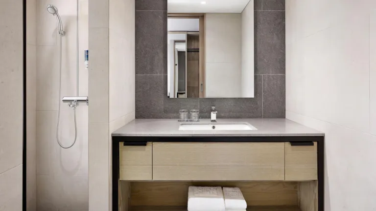 욕실에는 세면대, 변기, 샤워룸이 설치되어 있다. 어메니티로 샴푸, 린스, 바디워시가 디스펜서 형식으로 제공된다. 그 밖에도 바디로션, 비누, 치약, 칫솔, 빗, 수건, 헤어드라이어 등이 준비된다.