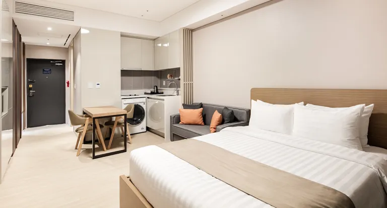 골든튤립은 일반 객실과 레지던스 타입, 크게 2가지 객실을 운영하고 있다. 레지던스 타입은 주방을 갖추고 있어 취식이 가능하다. 전자레인지와 세탁기도 있어 편리하다.
