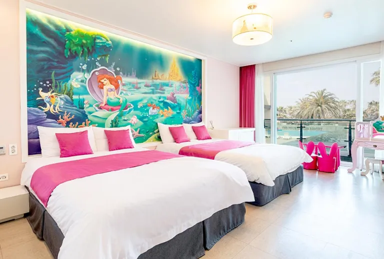 제주 더포그레이스리조트 프리미어 키즈 트윈룸은 더블베드 2개로 구성된 객실이다. 아이들이 좋아하는 공주 캐릭터 인테리어로 높은 예약률을 자랑한다.