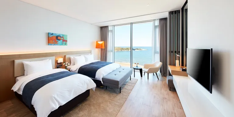 창밖으로 송지호 해변이 펼쳐지는 패밀리 디럭스룸은 화이트와 우드톤의 인테리어가 편안함과 쾌적한 분위기를 풍긴다.