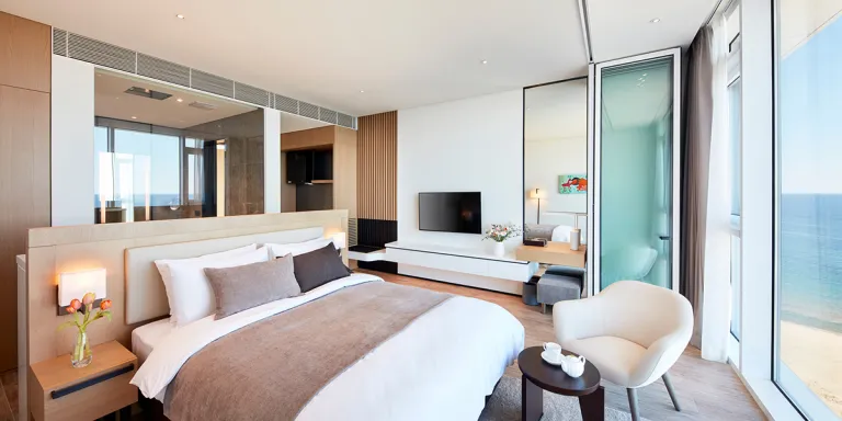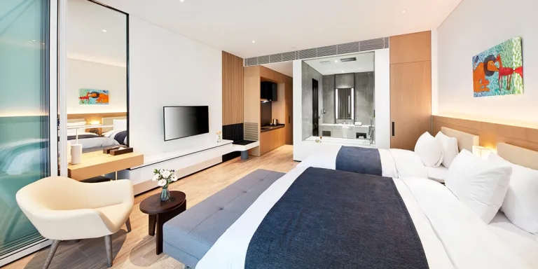 객실 내부에는 퀸 베드 1개와 싱글베드 1개가 놓여 있고, 49인치 TV, 화장대, 안락의자, 티 테이블, 빨래건조대 등을 갖췄다.