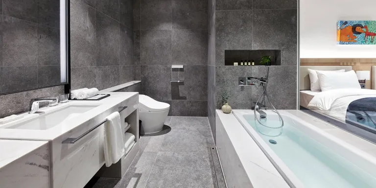 욕실에는 욕조가 설치되어 있고, 어메니티로는 C.O Bigelow의 샴푸, 컨디셔너, 바디워시, 바디로션, 비누가 준비돼 있다. 이와 함께 칫솔, 치약, 헤어드라이어, 수건, 면봉, 화장솜까지 제공된다.