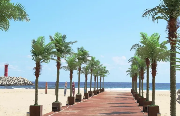 송지호 해변에서 조금 더 내려와 봉수대 해수욕장 근처에 위치한 해쉼터 카페는 하와이 느낌이 물씬 풍기는 이국적인 카페이다. 나무데크길 양옆으로 야자수 조형물이 설치되어 있어 휴양지에 여행 온 듯 인생 사진을 남길 수 있다.