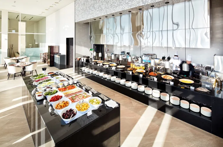 아침식사는 고성 르네블루 바이 워커힐의 레스토랑인 블루키친에서 오전 7:00 ~ 10:00 사이에 제공되고 있다. 캐주얼한 아메리칸 컨셉의 뷔페로 50여 종의 다양한 간편 요리를 즐길 수 있다.