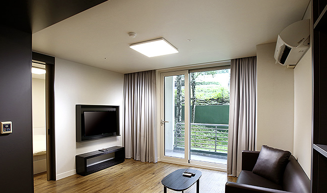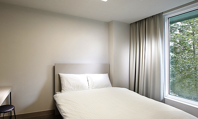 그린동 스탠다드 룸은 모던한 분위기에 깔끔한 객실이다. 4인용 식탁, 냉장고, 전자레인지, 전기포트, 취사도구, 그릇, 컵, 조리도구, 수저와 젓가락, 포크 등은 준비되어 있다.
